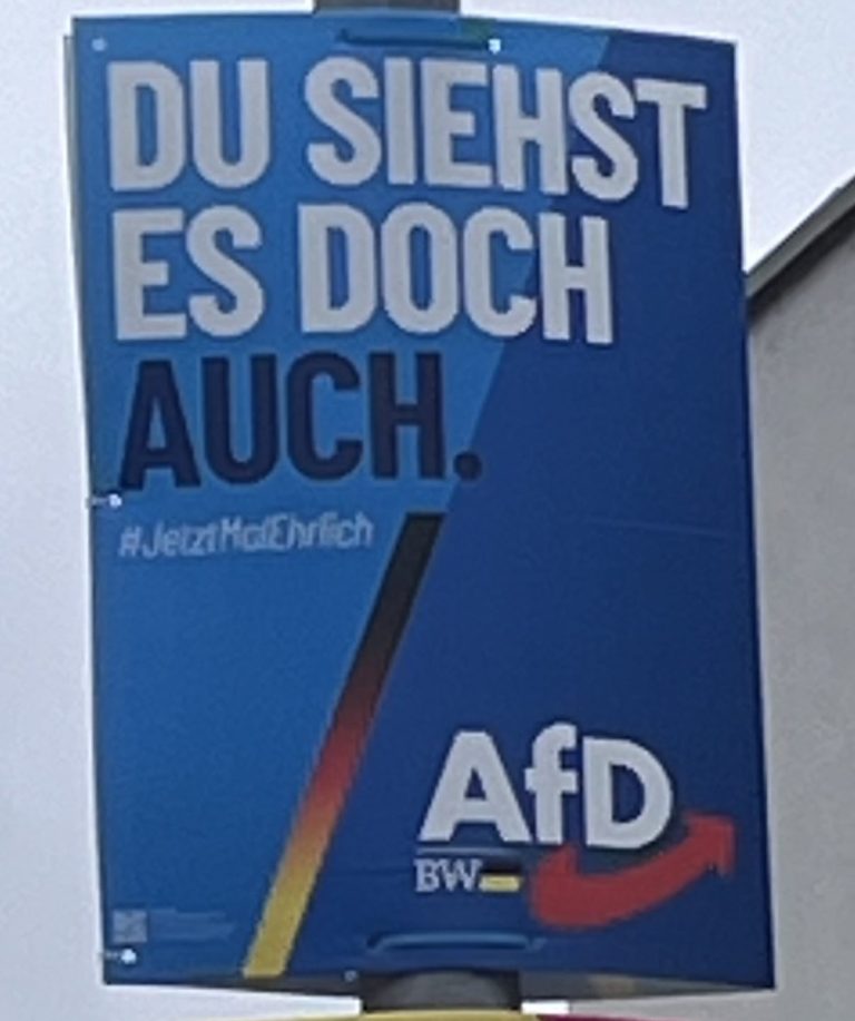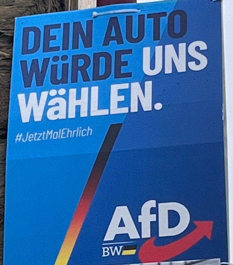 Gut, dass Autos kein Wahlrecht haben. Doch wie kommt die AfD auf solch einen peinlichen Slogan? Indem sie die Automobilindustrie mit dem steinzeitlichen Verbrennungsmotor in den Untergang treibt? Setzt man die Pläne der AfD um, würden wir in wenigen Jahrzehnten vermutlich nur noch amerikanische und chinesische E-Autos fahren, weil der deutschen Automobilindustrie der Todesstoß versetzt wird. Stattdessen sollte man auf neue Technologien setzen und ein Vorreiter der klimaneutralen Mobilität werden. Doch wer nach Technik aus den 1960ern sucht, wird wirtschaftlich niemals Erfolg haben können. Letztlich ist die AfD der Untergang der deutschen Wirtschaft und ein Wegbereiter für einen beispiellosen Wohlstandsverlust in unserer Bevölkerung.