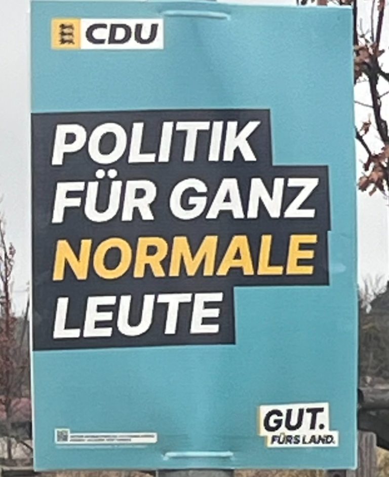 Ich bräuchte auf alle Fälle mal eine detaillierte und umfangreiche Liste von der CDU, welche Merkmale und Eigenschaften "ganz normale Leute" so haben und warum die CDU das Recht hat, zu bestimmen, wer oder was "ganz normal" ist. Vor allem: Was ist denn NICHT "normal", liebe CDU?