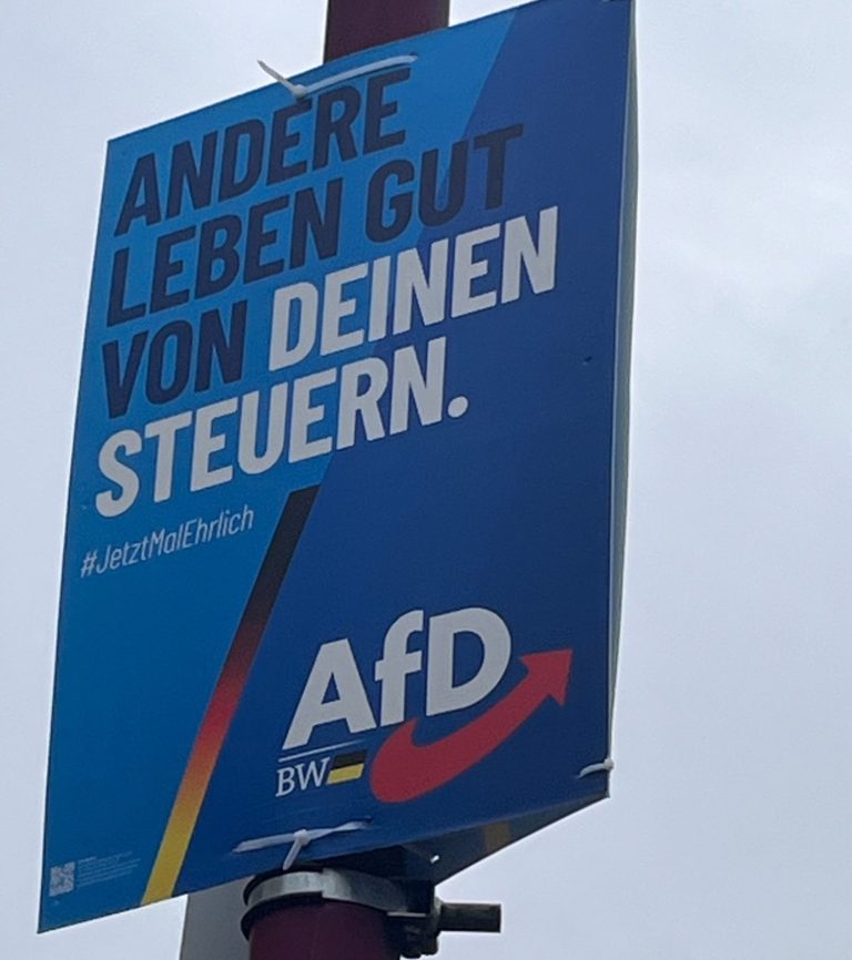 Vollkommen richtig! Zum Beispiel die Superreichen, die im Schnitt nur ca. 26-29% Steuern zahlen müssen, während der Mittelstand ganze 43% an Abzügen leisten muss. In Deutschland wird Arbeit durch die Einkommenssteuer bestraft, Kapital jedoch verschont. Deshalb fordern die Grünen, die Linke und die SPD vollkommen zurecht die Wiedereinführung der Vermögenssteuer, welche dem deutschen Staat diverser Berechnungen zufolge bis zu 147 Milliarden Euro beschaffen könnte und somit die Finanzierungsgrundlage für die künftigen Jahrzehnte wäre. Die AfD, die Union und die FDP sind gegen solch eine Reform. Stattdessen will die AfD mit dem Plakat mutmaßlich suggerieren, dass Flüchtlinge und Bürgergeld-Empfänger von "unseren" Steuern profitieren würden - eine Verdrehung der Tatsachen und blanker Populismus zu Gunsten des eigenen Superreichen-Klientels.