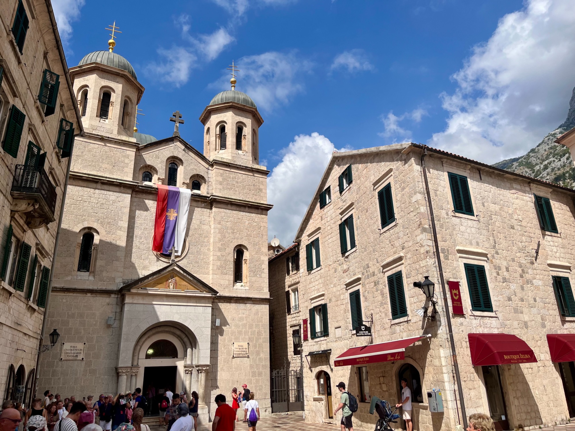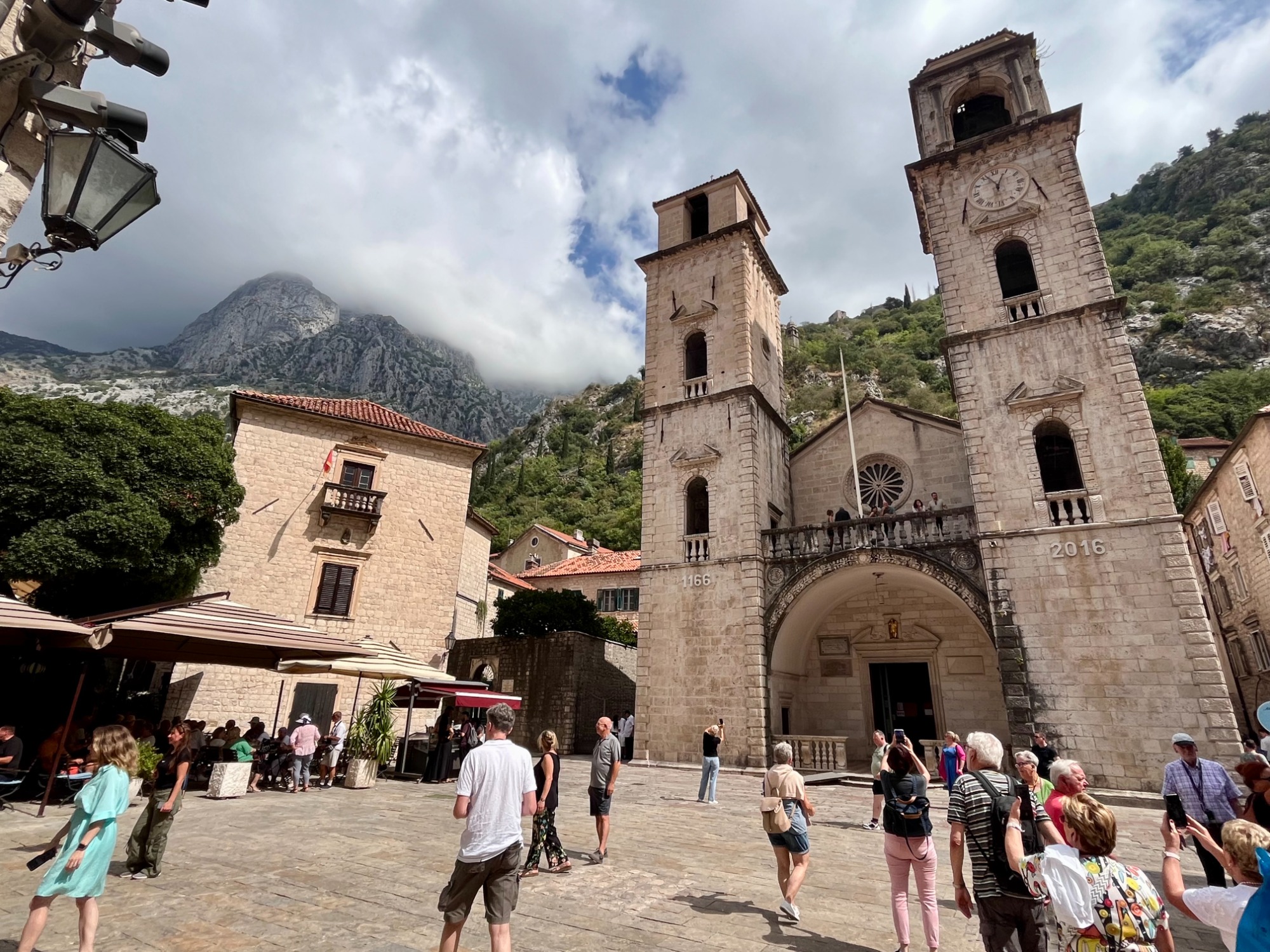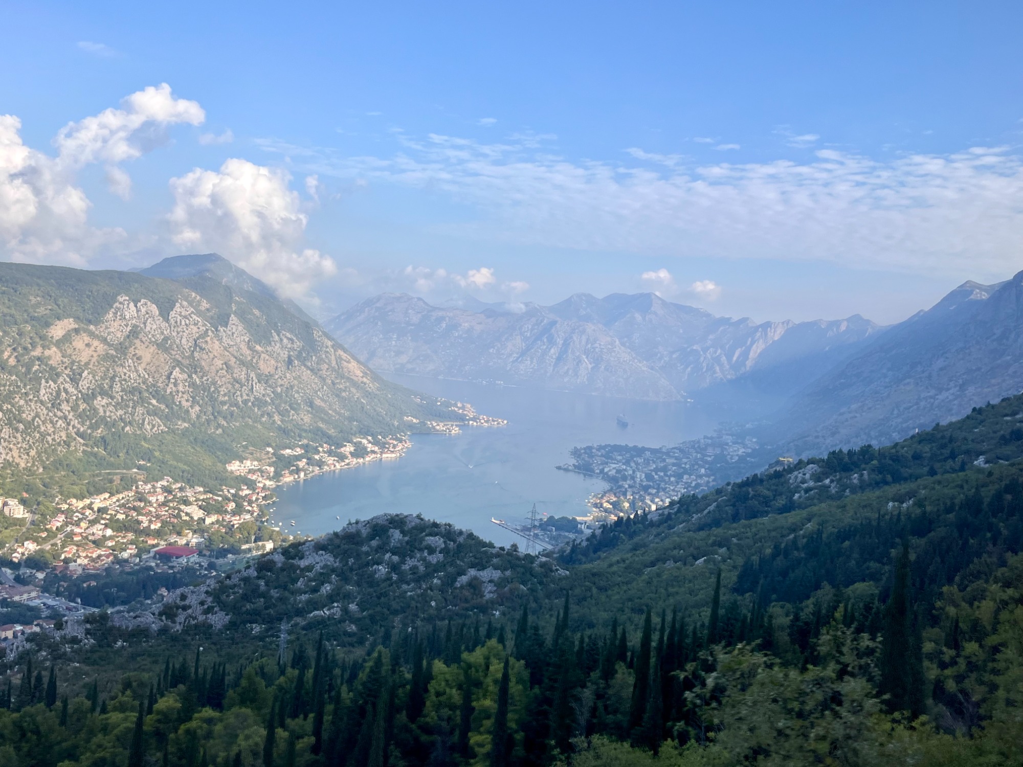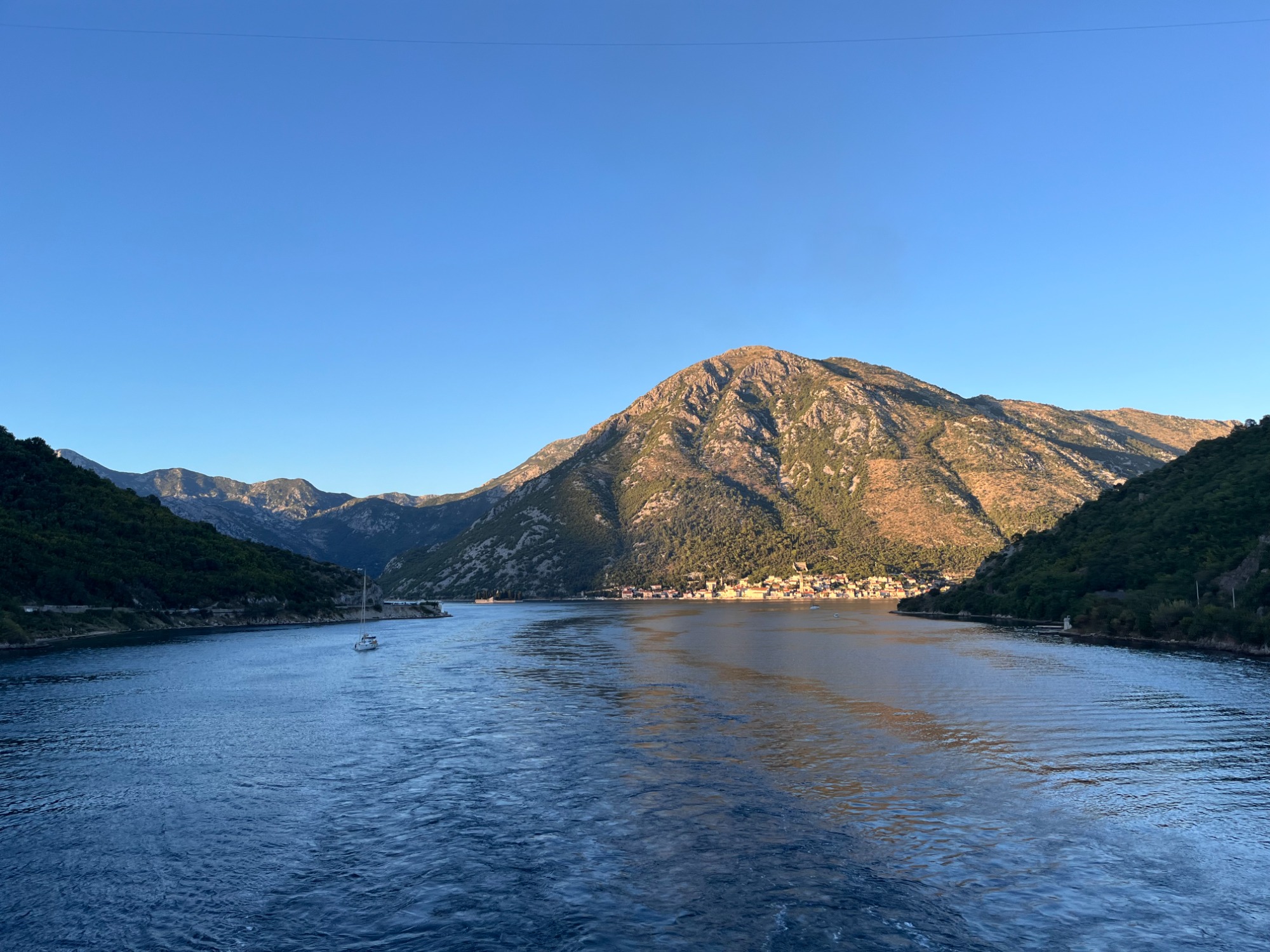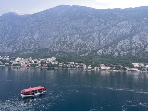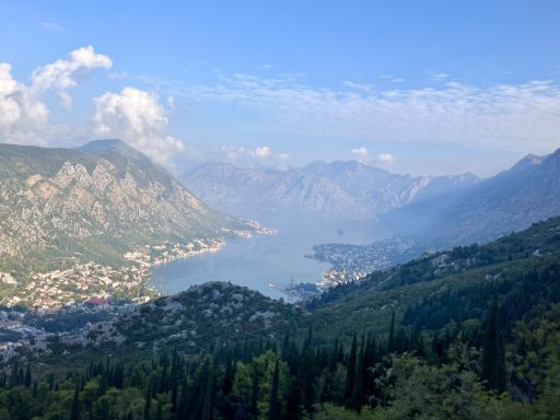 Der erste Hafen der Reise war das montenegrinische Kotor, welches am Ende der malerischen Bucht von Kotor, welche auch als südlichster Fjord Europas bezeichnet wird, liegt. Neun Tage später lag das Schiff erneut in Kotor, doch nur beim ersten Anliegen begaben wir uns an Land. Dabei fuhren wir zuerst mit dem Bus über einen engen Serpentinenweg zu einem Aussichtspunkt auf die Bucht von Kotor, ehe wir ins Bergdorf Njeguši, in die ehemalige Hauptstadt Cetinje und in die Küstenstadt Budva weiterfuhren. Am Ende der Tour durchliefen wir mit der Guidin die Altstadt Kotors, bevor wir mit Tenderbooten zurück auf das Schiff gelangten. Neun Tage später, bei unserem zweiten Aufenthalt in Kotor, konnte man das Panorama der wunderschönen Bucht vom Schiff aus bestaunen.