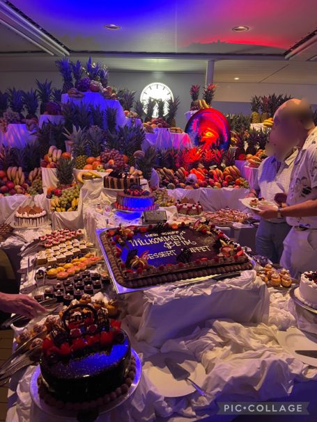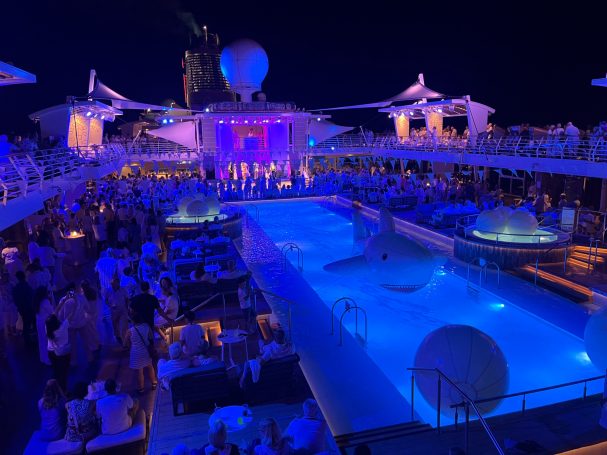 An zwei Abenden der Reise fand die sogenannte "White Night Pool Party" auf dem Pooldeck statt. Zwar eignet sich das Pooldeck nur bedingt für eine musikalische Party, doch das riesige Dessert-Buffet war ein großes Highlight.