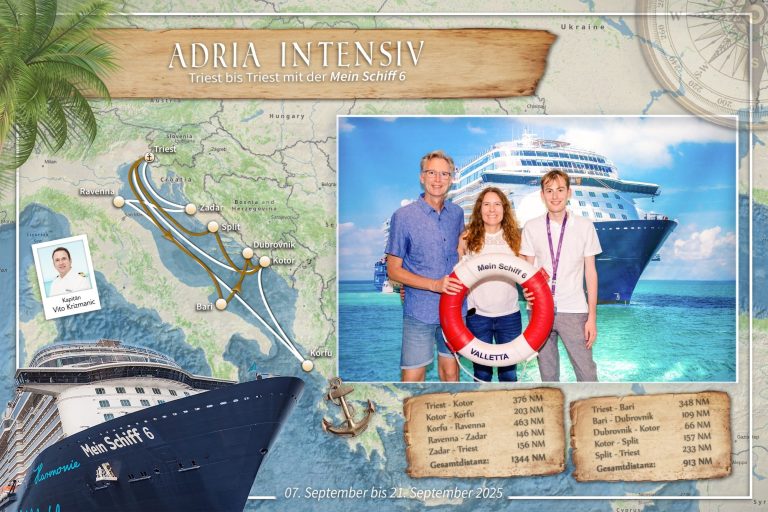 Vom 07.09.2025 bis zum 21.09.2025 reiste ich mit meinen Eltern und Großeltern auf der Mein Schiff 6 durch die Adria. Wir legten von Triest aus an sieben verschiedenen Häfen an und besuchten im Laufe der Reise sieben verschiedene Länder, nämlich Italien, Montenegro, Griechenland, Albanien, San Marino, Slowenien und Kroatien.
