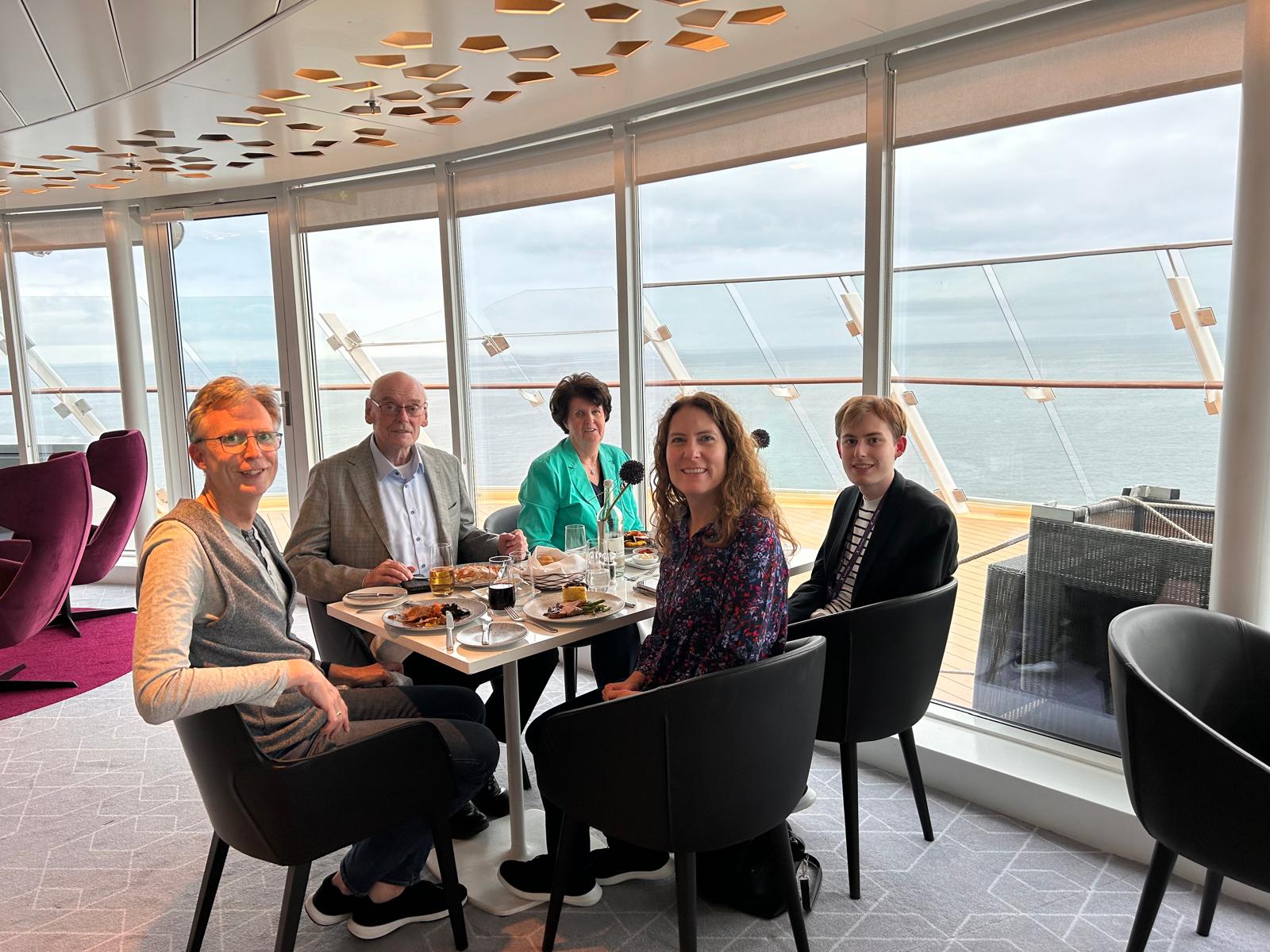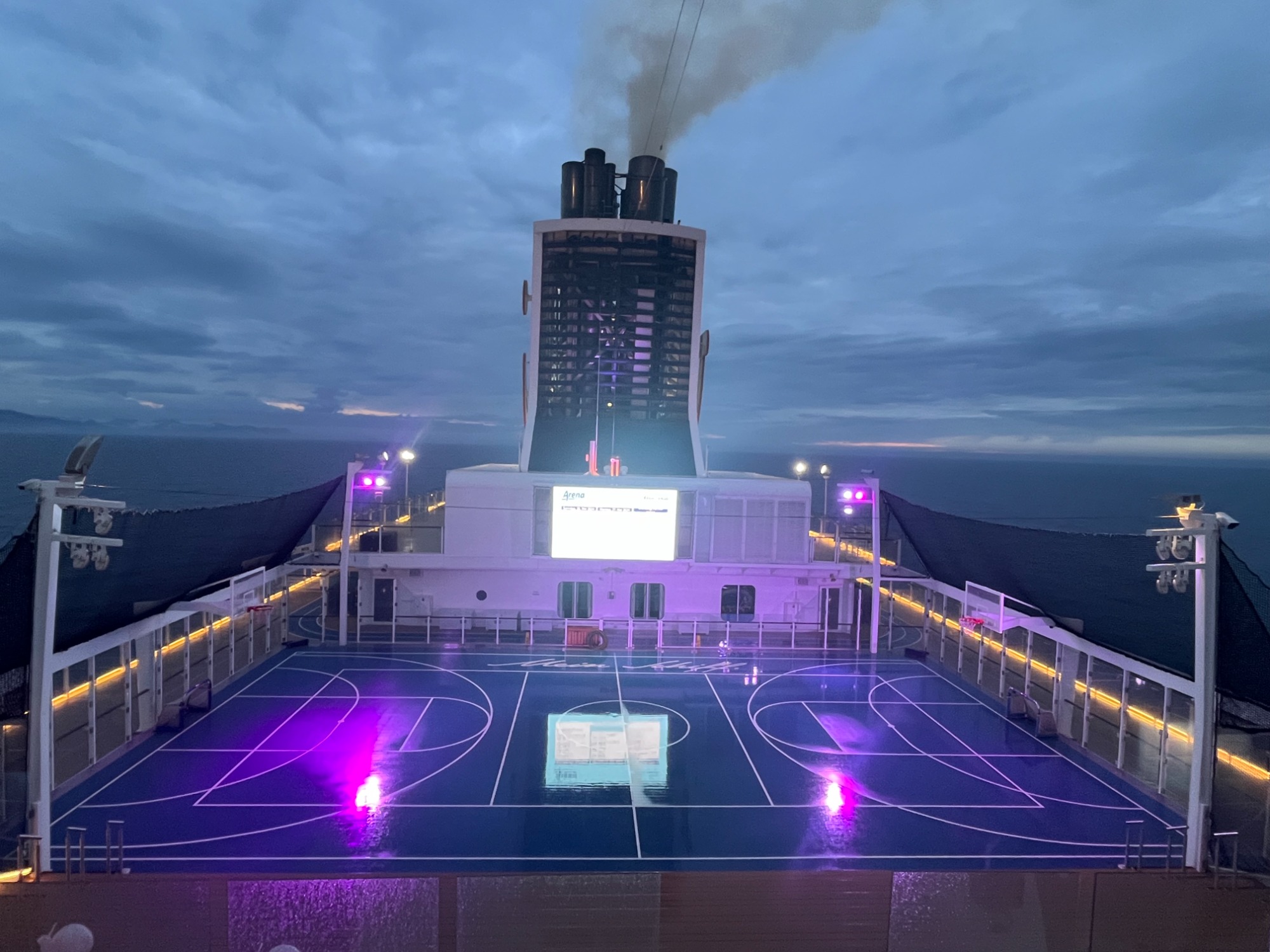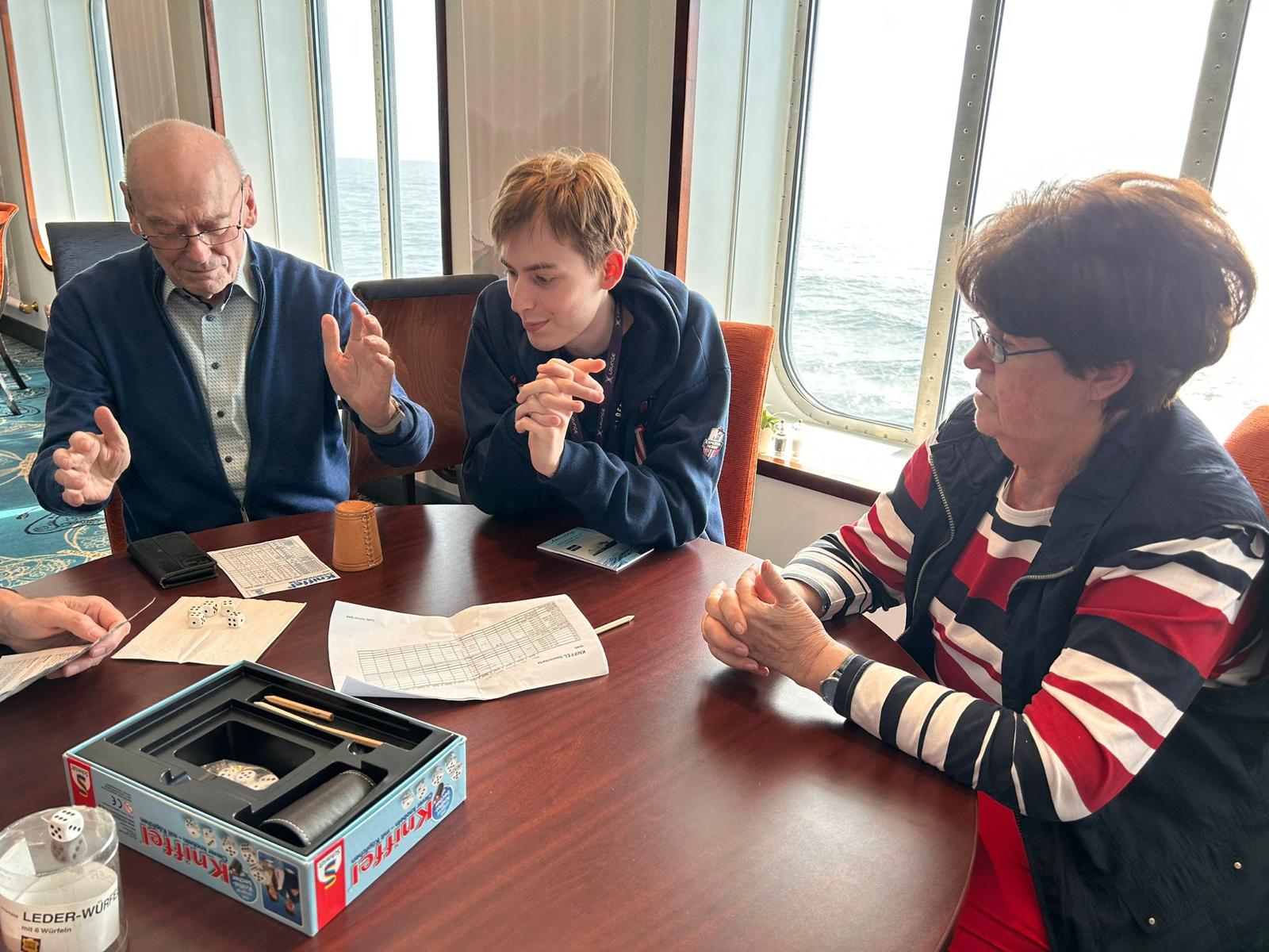 An den Seetagen sind die zahlreichen Angebote auf dem Schiff von großer Bedeutung. So besuchten wir an fast jedem Tag die Abendshow im Theater, wo Gesang, Tanz und Akrobatik zu sehen waren. Außerdem erfreuten wir uns sehr über die zwei Auftritte des Anwalts Stephan Lucas, der bereits häufig in den Gerichtsshows von Richter Alexander Hold und Ulrich Wetzel auftrat und somit als echter "Bord-Promi" bezeichnet werden kann. Neben dem Entertainment-Programm wird auch kulinarisch ausgezeichnet für einen gesorgt. Als Suitengäste hatten wir beispielsweise Zugang zur X Lounge, wo wir gelegentlich speisten. Zudem aßen wir in allen drei Spezialitäten-Restaurants sowie sehr häufig in den beiden Atlantik-Restaurants und im Buffet-Restaurant. Ein großes Highlight war die Feier zur Überquerung des nördlichen Polarkreises, als ein riesiges Dessert-Buffet an Deck aufgebaut wurde.